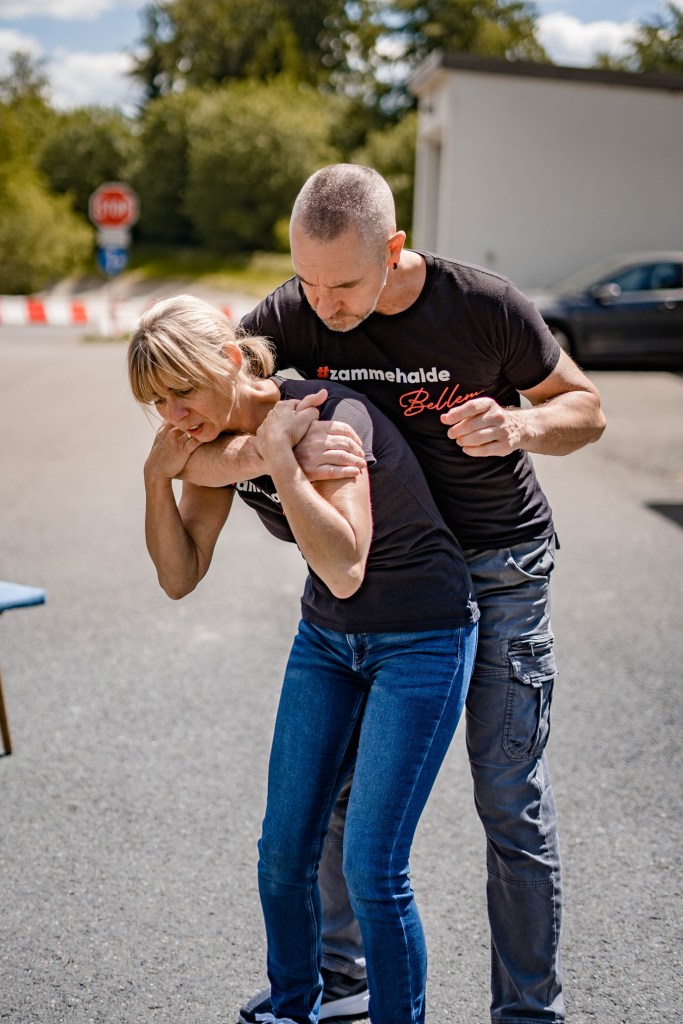 Um trotzdem Übungen mit Körperkontakt zu zeigen, hat unser Trainer seine Frau mitgenommen, denn Sicherheit geht vor.